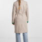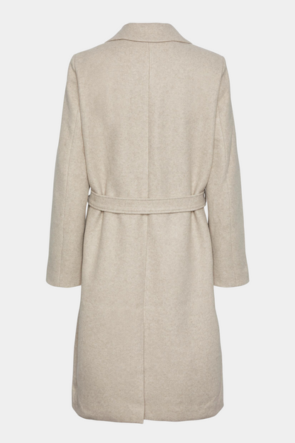 jakke, frakke, trenchcoat, coat, jacket, uld, wool, fleece, filt, blød, soft, overgangsjakke, efterårsjakke, beige, meleret, melange, bælte, bindebånd, lang, long, klassisk, classic, staple, elegant, fin, feminin, kvinde, dame, woman